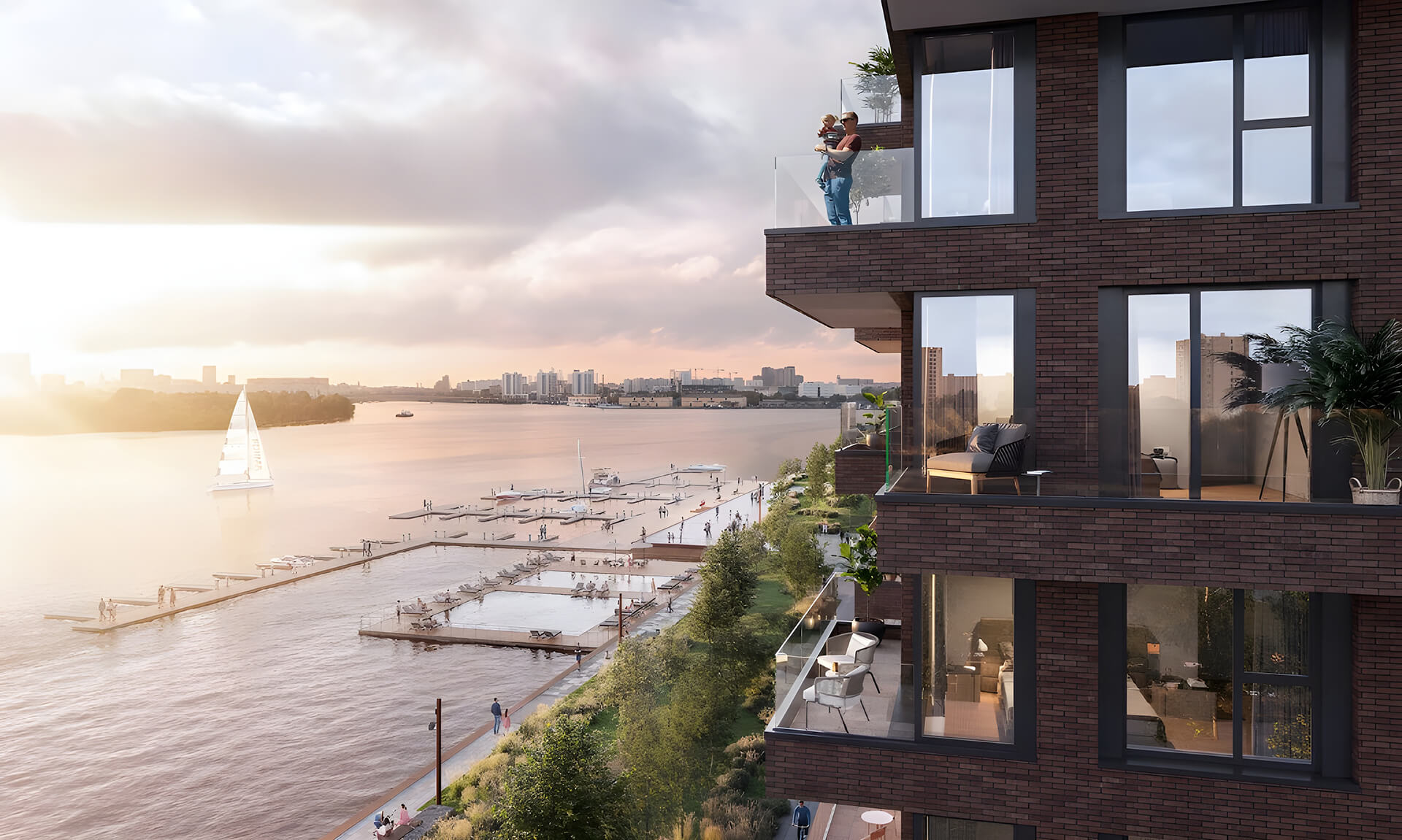 Высотность корпусов варьируется, создавая живой ритм силуэтов, при этом многие квартиры ориентированы на реку: 95% жилых помещений имеют виды на Москву-реку, а угловое остекление обеспечивает естественное освещение и ощущение связи с водой. Панорамные окна, просторные балконы или лоджии усиливают эффект открытости и связности с окружающей природой.