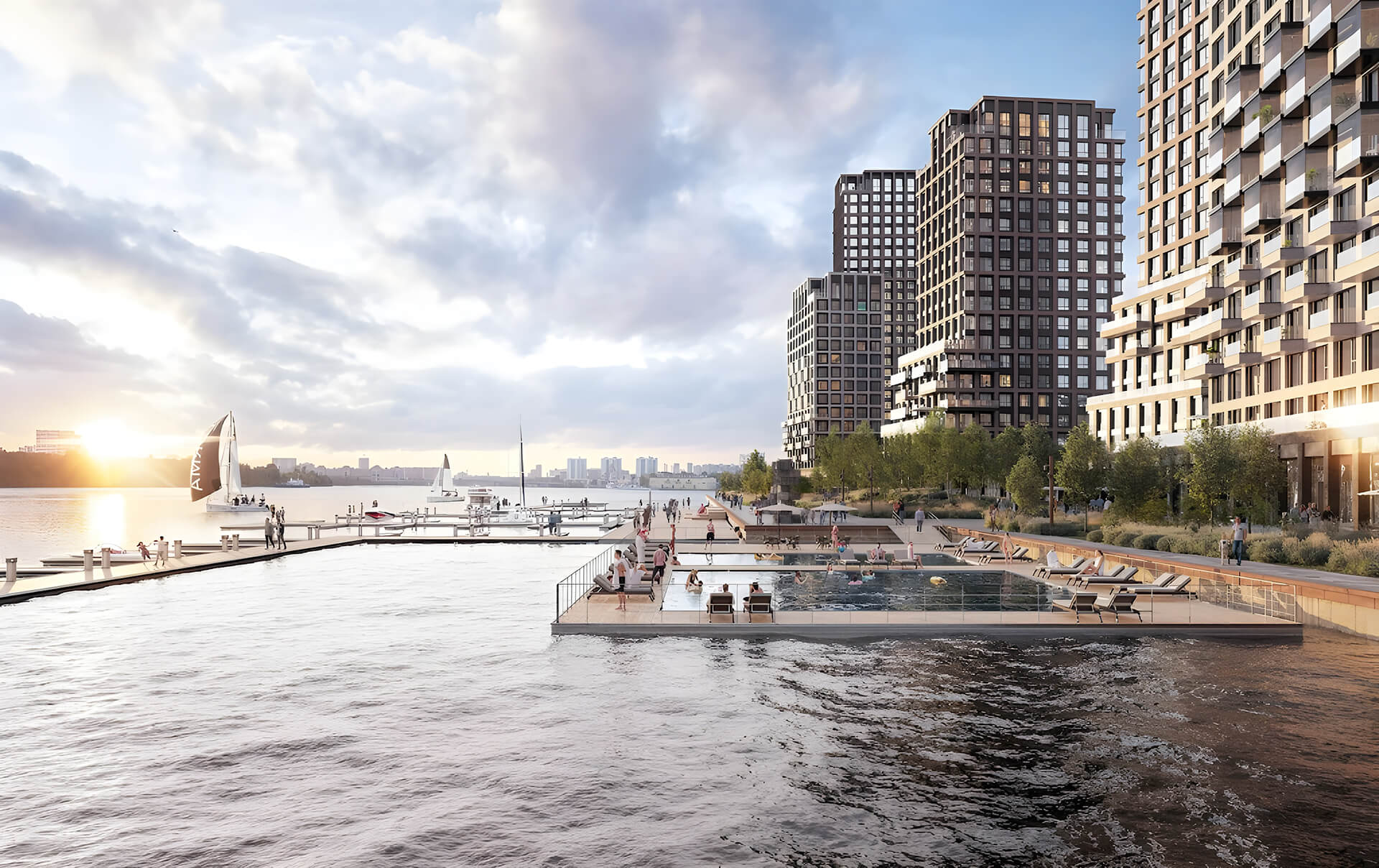 Кроме того, предусмотрены амфитеатры, детские площадки и спортивные зоны — места для встреч, культурных событий и семейного досуга. Все эти элементы создают полноценную инфраструктуру на территории, в которой сочетание природы и урбанистики отражает философию жизни у воды и высококлассного комфортного проживания.