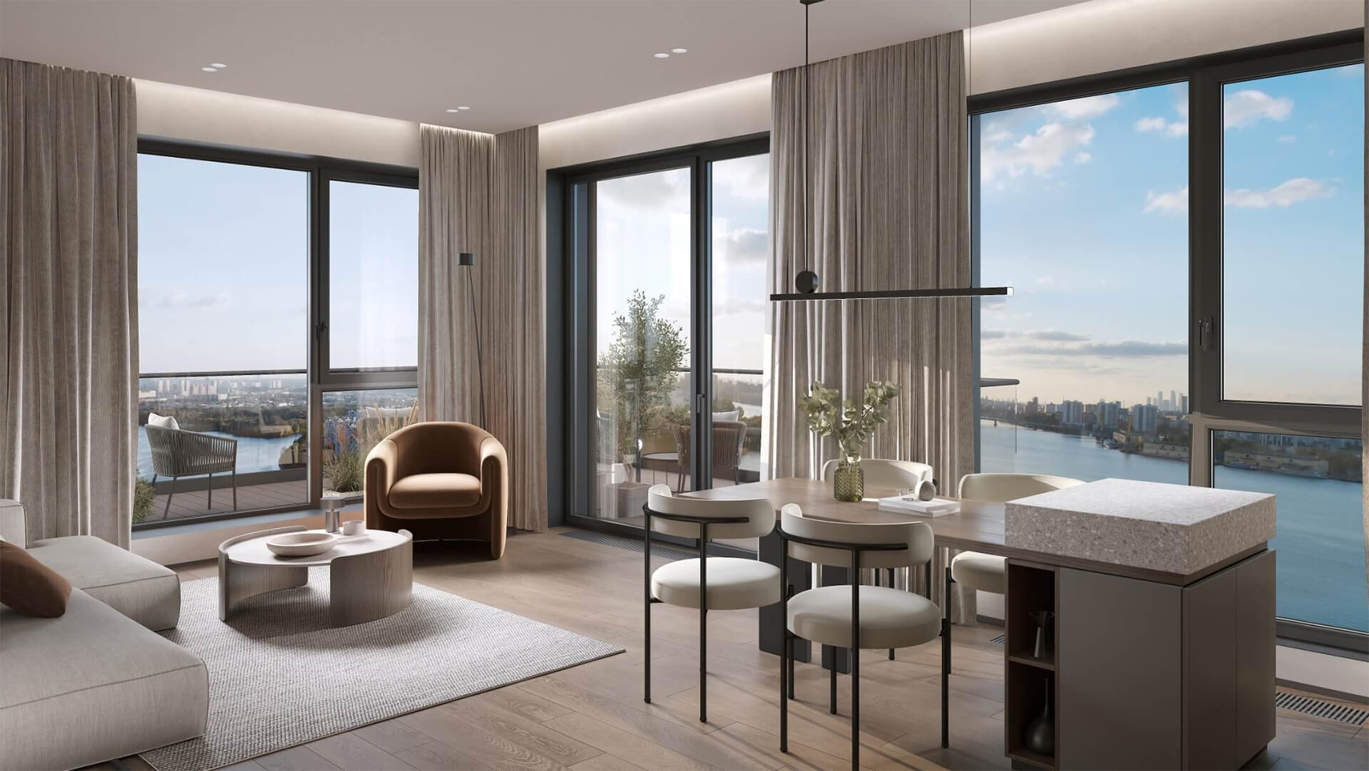 Высотность корпусов варьируется, создавая живой ритм силуэтов, при этом многие квартиры ориентированы на реку: 95% жилых помещений имеют виды на Москву-реку, а угловое остекление обеспечивает естественное освещение и ощущение связи с водой. Панорамные окна, просторные балконы или лоджии усиливают эффект открытости и связности с окружающей природой.