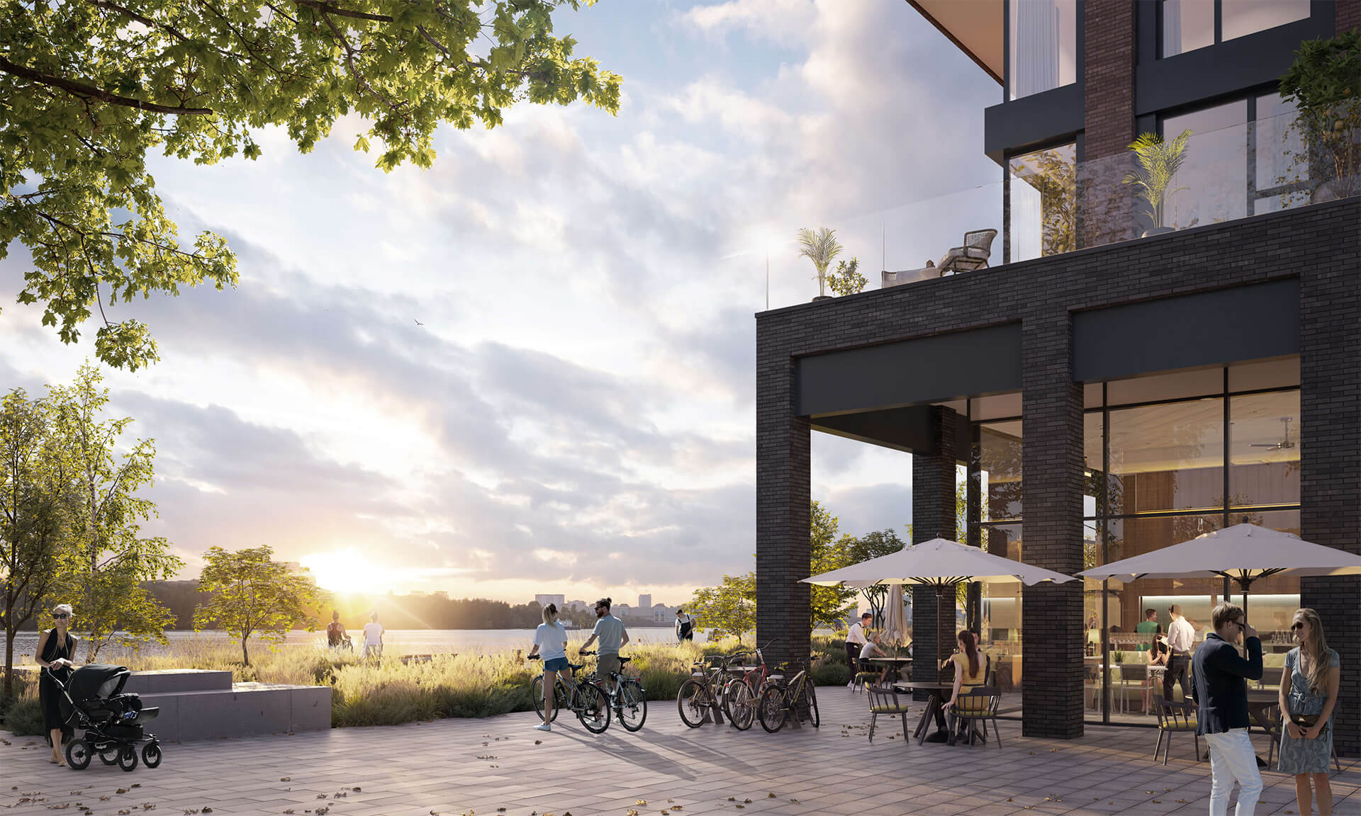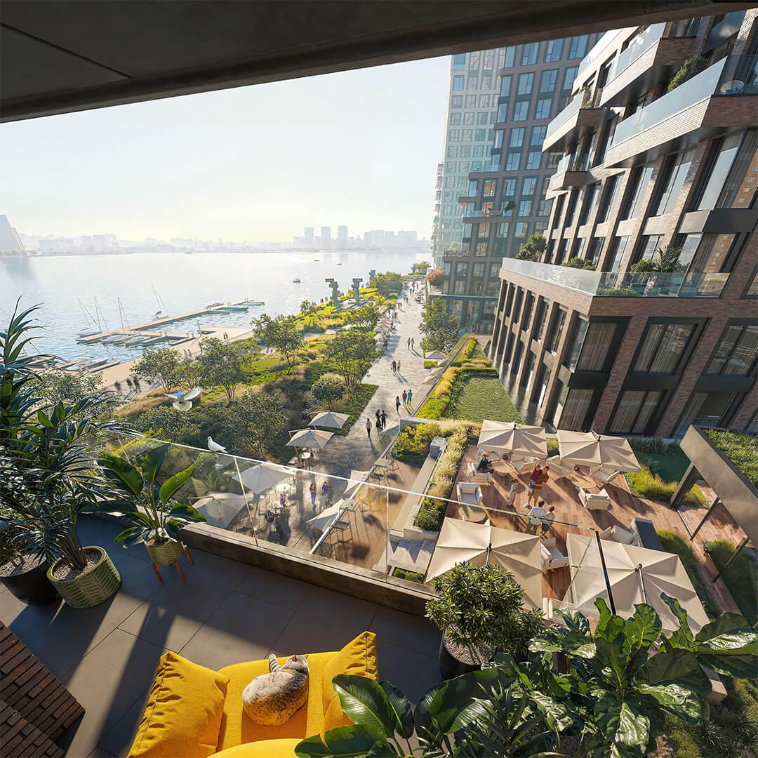 Ландшафтная архитектура дополнительно усиливает портовый характер: внутренние дворы спроектированы как приватные сады с зелёными насаждениями, пешеходными дорожками и зонами отдыха. Променад на набережной, частные выходы из зданий к воде и интегрированные террасы создают ощутимый диалог между архитектурой, рекой и жителями, делая «Портленд» живым, зелёным и динамичным пространством.