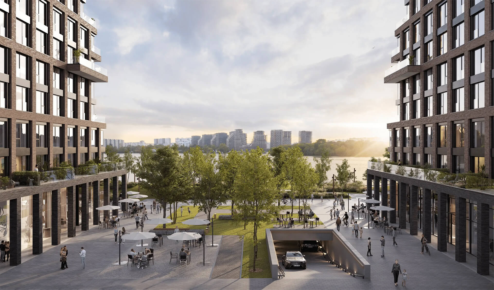 Набережная — ключевой элемент благоустройства: пешеходные маршруты, велодорожки, зоны отдыха и медитации, места для пикников. Благодаря архитектурным решениям, жители получают прямой выход к реке и могут наслаждаться красотой воды, свежим воздухом и панорамными видами. Это пространство также предлагает площадки для активного отдыха и общения, делая набережную центром жизни комплекса.